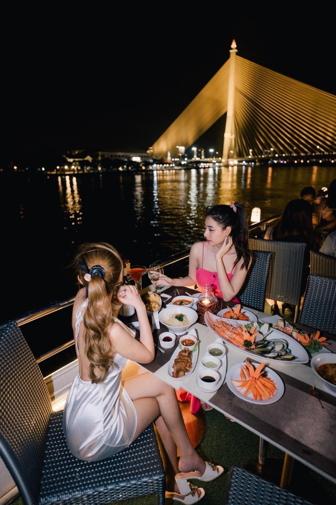 Hãy trải nghiệm bữa tối trên tàu dọc theo sông Chao Phraya. Bạn có thể thưởng thức các món ăn đa dạng trong không gian lãng mạn và tận hưởng cảnh quan đẹp của sông và thành phố về đêm.