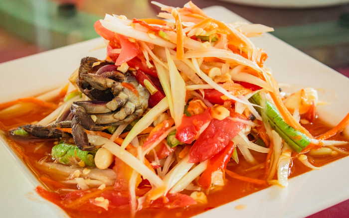 Som Tam là món gỏi xoài cay được chế biến từ xoài, cà rốt, ớt, đậu đen và nhiều loại rau thơm. Tất cả các nguyên liệu được xay nhuyễn trong một cái giã nhỏ và trộn với nước tương, đường, chanh và tỏi. Món ăn này có vị chua, cay và mặn cùng với hương vị ngọt của xoài.