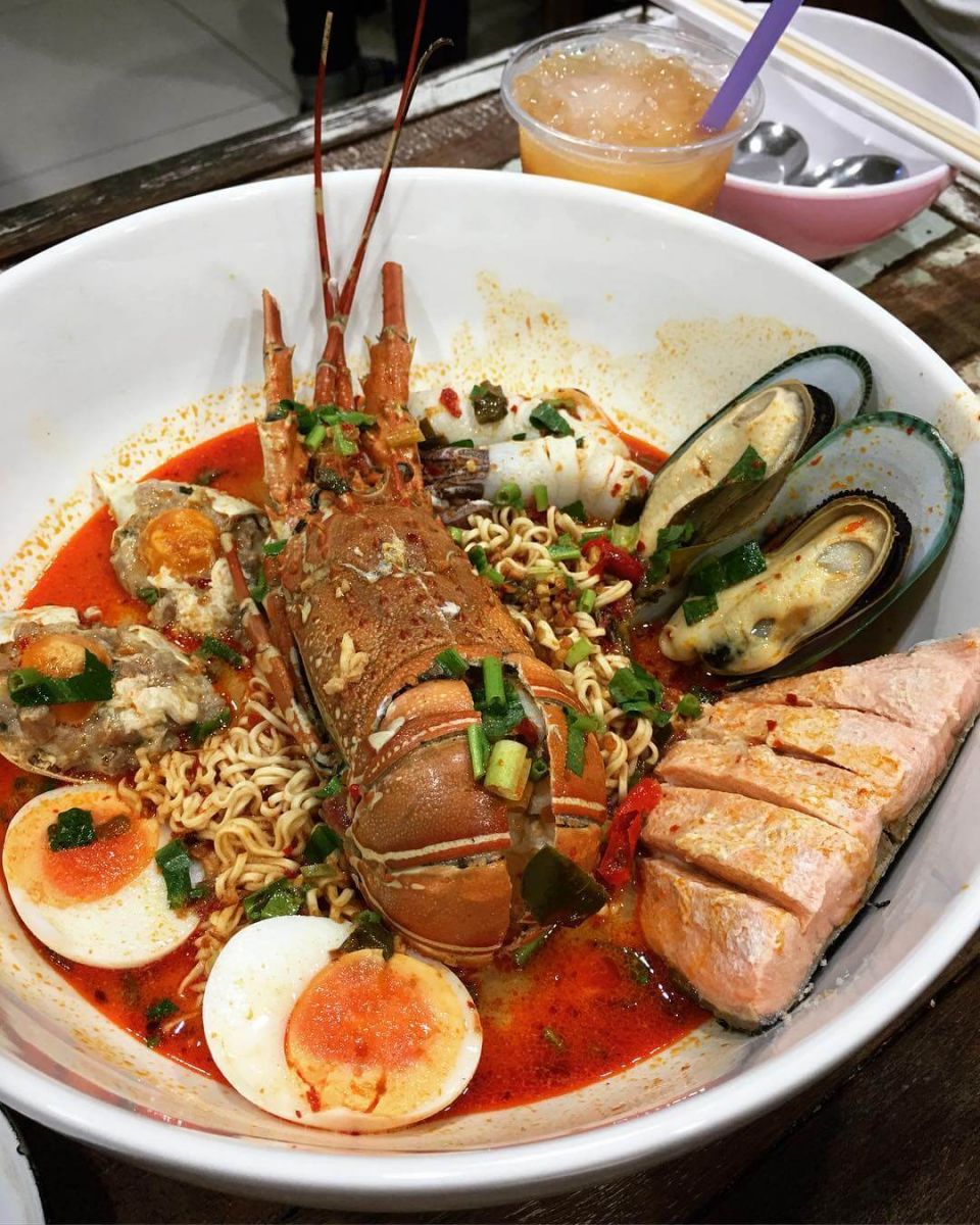 Tô “mỳ Tôm” khổng lồ có giá khoảng 1200bath (gần bằng 865k), giá tuy cao nhưng chất lượng thì miễn bàn, trong tô mỳ gồm 1 con tôm hùm, vẹm xanh, cua nhồi thịt, mực, trứng, cá hồi. Các bạn được tự chọn loại mỳ ăn kèm yêu thích, có 5 loại sợi mì để chọn lựa đó nha.