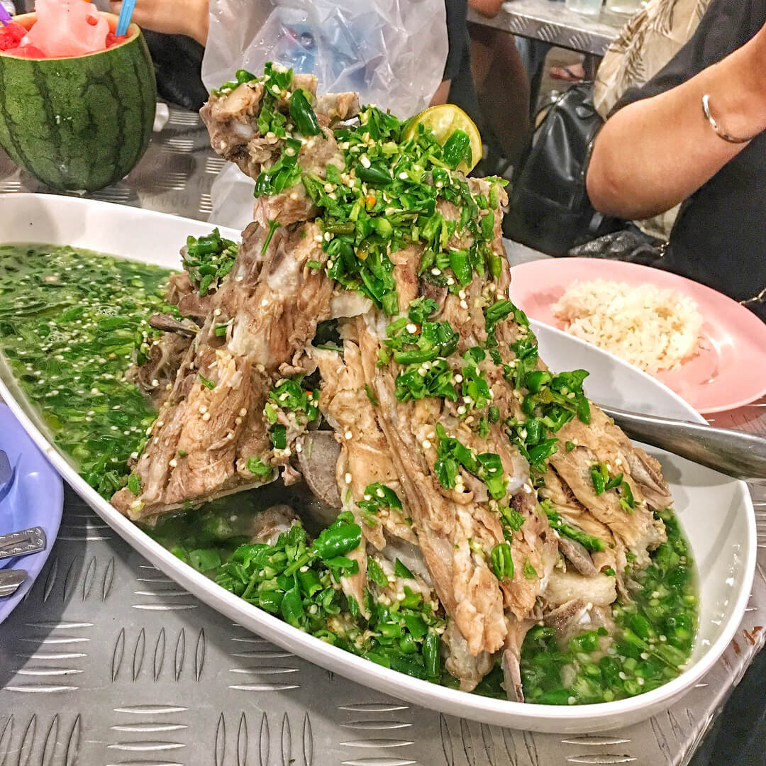 Món sườn khổng này đang được dân tình tại Sài Gòn bàn tán trên các trang mạng xã hội, quán nằm ở cuối chợ Rot Fai Ratchada. Tại đây món sườn được bán theo từng size, từ nhỏ đến lớn, và lớn nhất là size XXL dành cho nhóm 4-5 người ăn. Món này rất cay và chua nên chỉ giành cho người ăn cay tốt thôi nha.