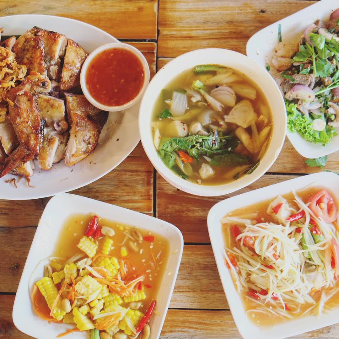Món ăn nên gọi: gà nướng, gỏi đu dủ, larb pork salad (ไก่ย่าง / ส้มตำและ / ลาบหมู)