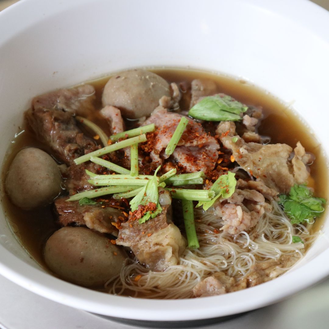 Món ăn nên gọi: Mì thịt bò – dùng cùng với mì loại nào là tùy vào sở thích của thực khách (ก๋วยเตี๋ยวเนื้อ)